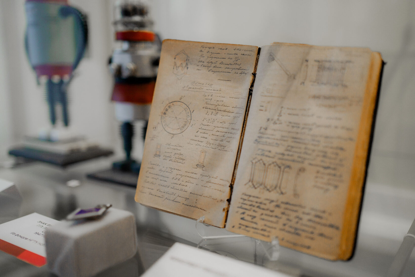 В историческую часть экспозиции вошли предметы, хранящиеся в музее вуза и предоставленные специально для выставки семьей Георгия Павловича Лыщинского. Раскрывают многогранную личность отца-основателя многочисленные награды, величественная мантия с серебряным поясом чести, портативная печатная машинка и даже курительные трубки. Впервые за пределы кампуса выехала известная в университете парочка роботов из 60-х годов — НЭТИ и Зося. Журнал регистрации браков, происшествий и иностранных студентов в общежитиях НЭТИ, поведает удивительные истории, охватывающие период с 1979 по 2002 год. Расскажут предметы зала «Становление» и о том, почему вуз называли Новосибирским эстрадно-танцевальным институтом, какими наградами отмечены его успехи, как выглядели первые стройотрядовцы.