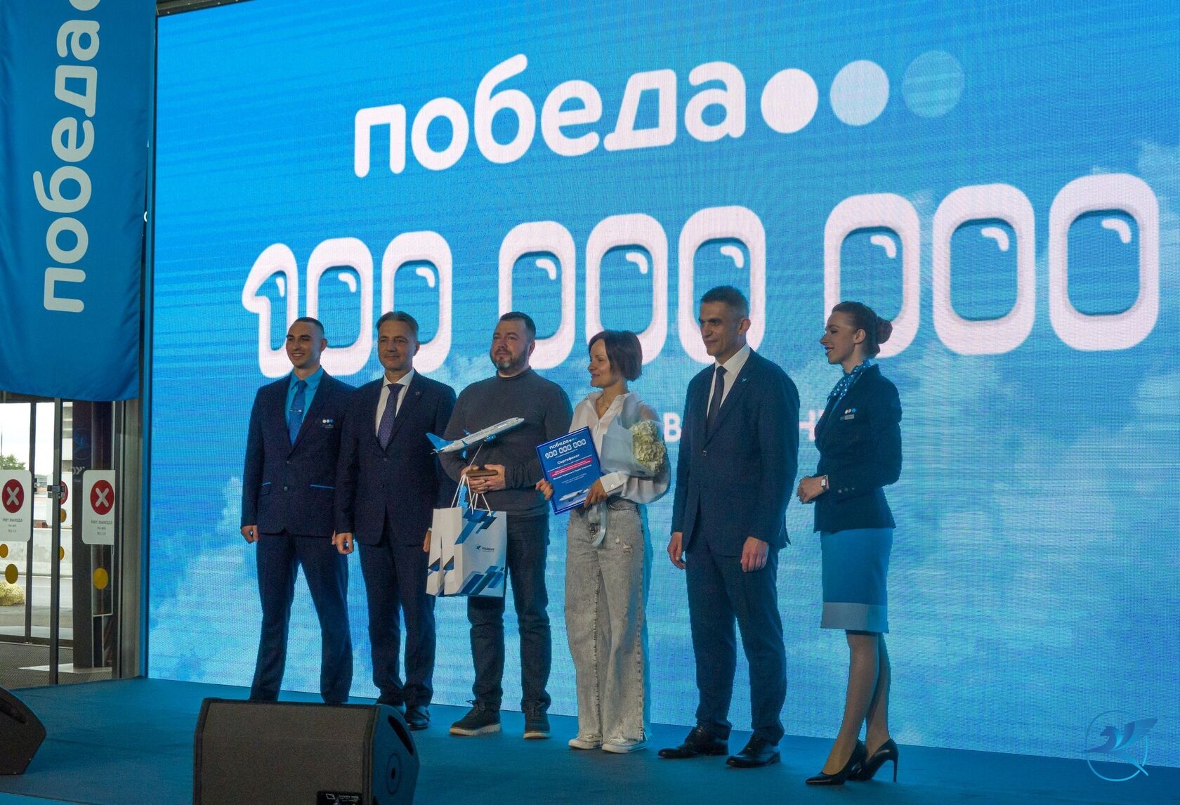 Открывая торжественную церемонию встречи стомиллионного - юбилейного пассажира лоукостера Заместитель Председателя Правительства Российской Федерации Виталий Савельев отметил: «Команда «Победы» – уникальна. Всего 177 сотрудников приходится на обслуживание миллиона пассажиров. Это в пять раз эффективнее мирового стандарта, ведь там задействовано 1000 сотрудников. Такая модель позволяет нашим пассажирам покупать дешевые билеты. Около 13% пассажиров «Победы» впервые в жизни смогли позволить себе путешествовать воздушным транспортом вместо поезда, автомобиля или автобуса. Поздравляю компанию с успехом и желаю дальнейших побед!».