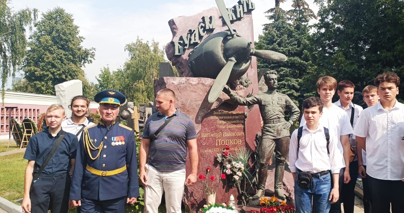 Участники патроната поклонились могиле почётного гражданина Москвы, лётчика-аса, участника Великой Отечественной войны, дважды Героя Советского Союза, генерал-лейтенанта авиации Виталия Ивановича Попкова, факты биографии которого легли в основу фильма Л. Быкова «В бой идут одни «старики»». Он стал прототипом комэска Титаренко («Маэстро») и лейтенанта Александрова («Кузнечик»).
