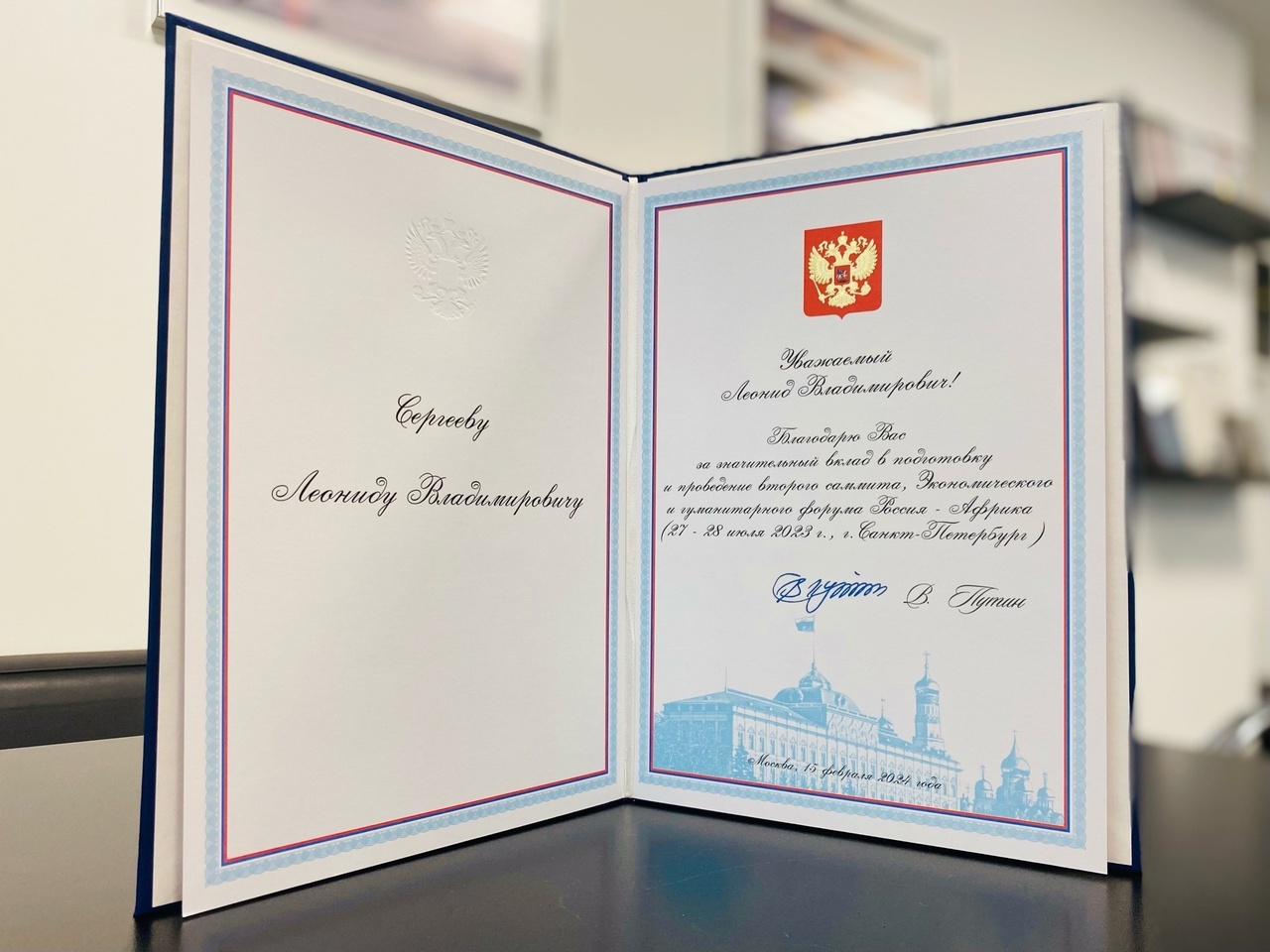 Президент Российской Федерации Владимир Путин отметил благодарностью генерального директора компании «Воздушные Ворота Северной Столицы», управляющей аэропортом Пулково, Леонида Сергеева за значительный вклад в подготовку и проведение второго саммита, экономического и гуманитарного форума «Россия–Африка» в 2023 году.
