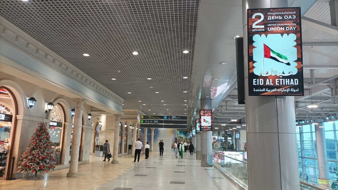 Московский аэропорт Домодедово поздравил своих партнеров и пассажиров из Объединенных Арабских Эмиратов, разместив на медиаповерхностях в аэровокзальном комплексе изображения государственного флага.