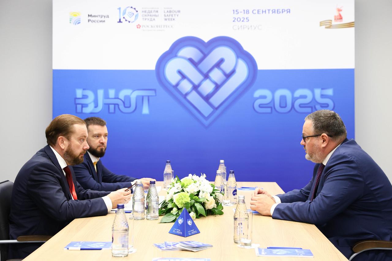 В рамках юбилейной Всероссийской недели охраны труда состоялась встреча Министра труда и социальной защиты Российской Федерации Антона Котякова и председателя правления, директора Фонда Росконгресс Александра Стуглева. Темой встречи стало развитие повестки ВНОТ на ведущих конгрессно-выставочных площадках в России и продвижение задач Министерства труда и социальной защиты Российской Федерации на крупнейших деловых мероприятиях в стране.