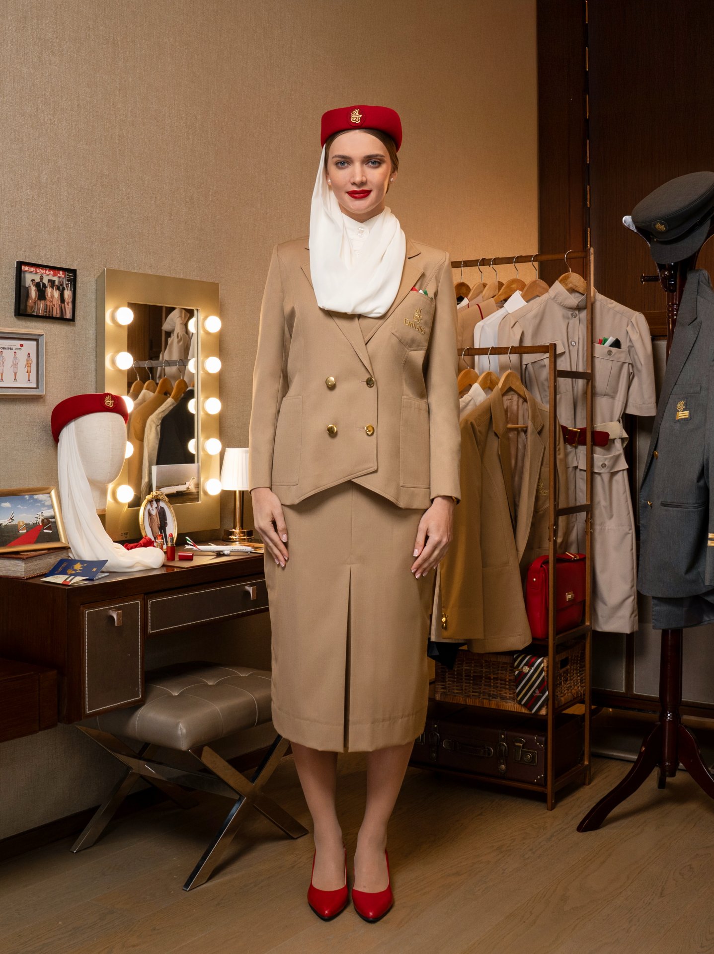 В 1987 году Эмирейтс представила обновленную униформу для бортпроводниц. Новый образ включал двубортный пиджак бежевого цвета с крупными золотыми пуговицами, удлиненную юбку с глубокой складкой, белую блузку с едва заметным узором в виде логотипа Эмирейтс, а также фирменную красную шляпу и вуаль. Золото по-прежнему оставалось ключевым акцентом в образе бортпроводников Эмирейтс — этот цвет был использован на ливрее первого борта авиакомпании и выбран как отсылка к Дубаю. Мужчины продолжали носить первоначальную форму 1985 года. И зимой, и летом все 180 членов экипажа носили в нагрудном кармане платок-паше в цветах флага ОАЭ.