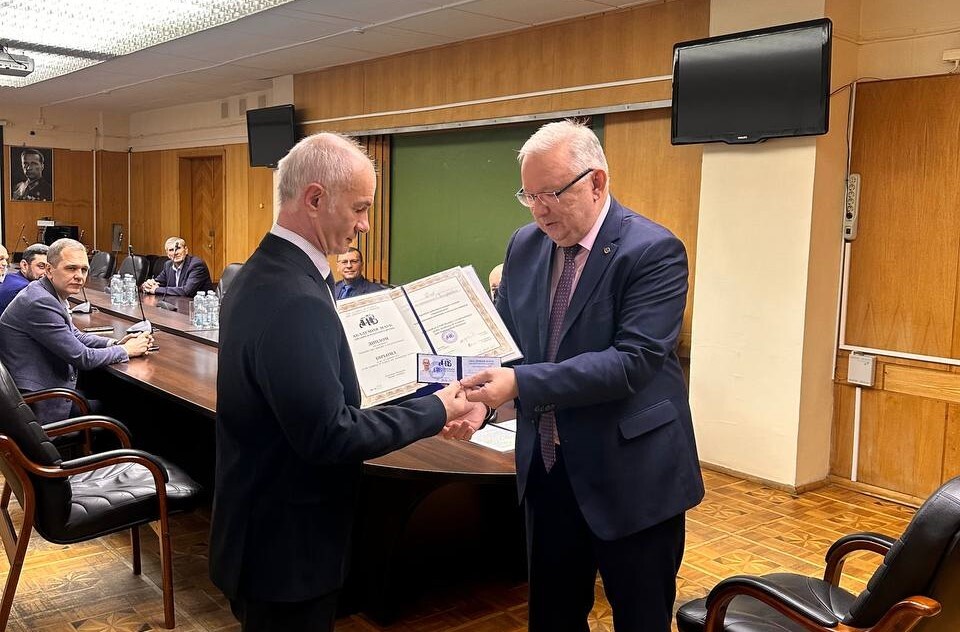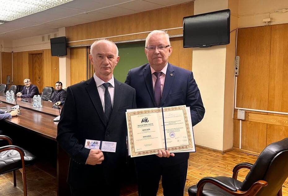Генеральный директор АО «ЛИИ им. М.М. Громова», академик Академии наук авиации и воздухоплавания (АНАиВ) Евгений Юрьевич Пушкарский вручил диплом и удостоверение АНАиВ первому заместителю АО «ЛИИ им. М.М. Громова» Дееву К.В.