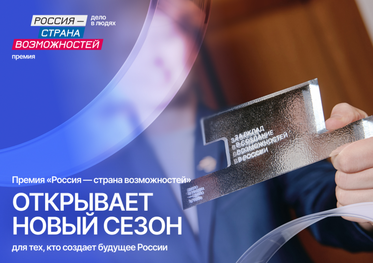 26 сентября 2025 года открывается прием заявок на второй сезон Премии «Россия – страна возможностей», организованной президентской платформой «Россия – страна возможностей». Подать заявку может любой гражданин России с 18 лет, даже если он живет или работает за рубежом. Регистрация открыта на официальном сайте премии до 16 октября 2025 года. Премия «Россия — страна возможностей» не ищет лучший проект, а награждает тех, кто своим примером, деятельностью и отношением к миру создает возможности для других. Во втором сезоне побороться за победу в новой номинации смогут целые регионы, формирующие среду для роста талантов, поддержки инноваций и раскрытия потенциала своих жителей.
