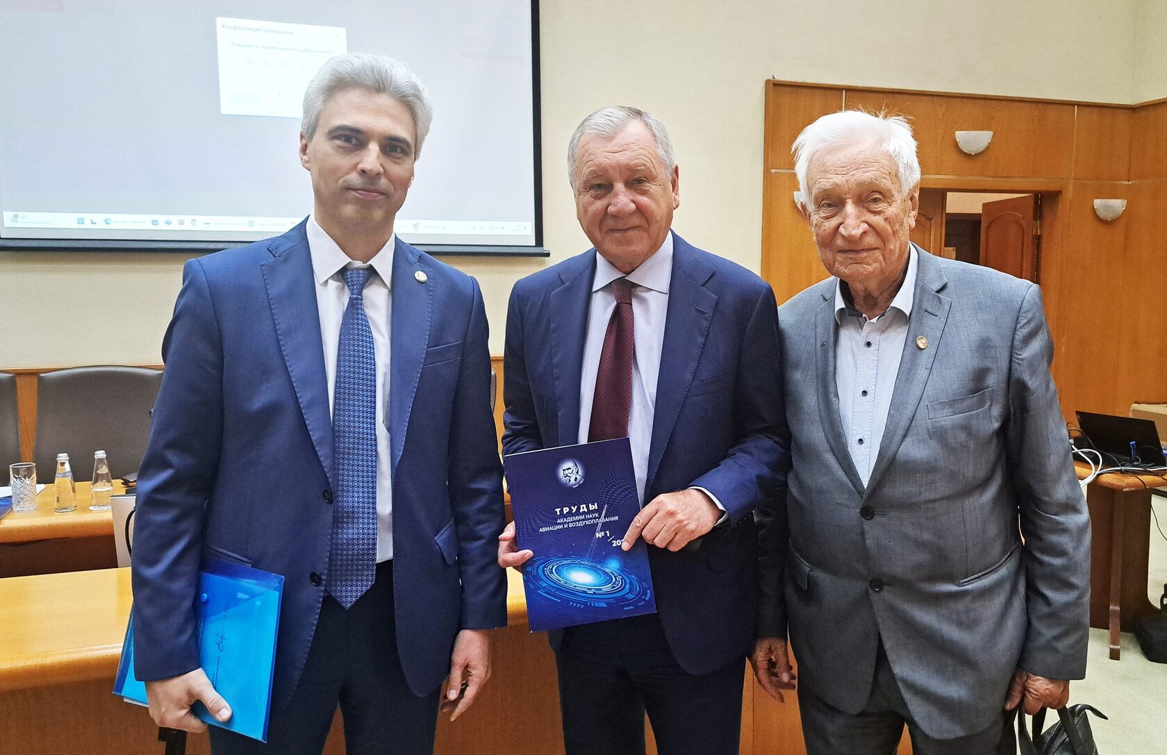 В завершении заседания члены президиума Академии наук авиации и воздухоплавания: Президент Виктор Чуйко и Вице-президент Денис Иванов, передали очередной номер журнала «Труды Академии наук авиации и воздухоплавания» Президенту Союза авиапроизводителей России, академику РАН Борису Алёшину.