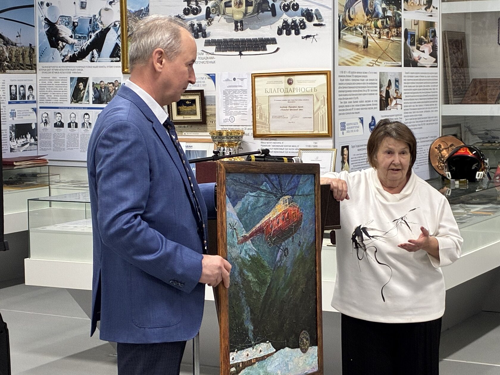 В честь исторической даты Надежде Михайловне Миль, дочери великого авиаконструктора, вручили награду отца – заводской знак отличия «Почетный Вертолетостроитель КВЗ», учрежденный в год 80-летия предприятия. Надежда Михайловна в своем докладе рассказала о создании вертолета Ми-8 и передала в дар Музею Трудовой Славы оригиналы писем и фотографий М.Л. Миля. На одном из снимков – показ нового серийного вертолета Ми-8 руководству Советского Союза во главе с Леонидом Брежневым, на другом – Михаил Миль с конструкторами со всего мира возле «восьмерки» во время Международного аэрокосмического салона в Ле Бурже (Париж). Кроме того, музею предприятия преподнесли картину с изображением другого легендарного вертолета – Ми-4.