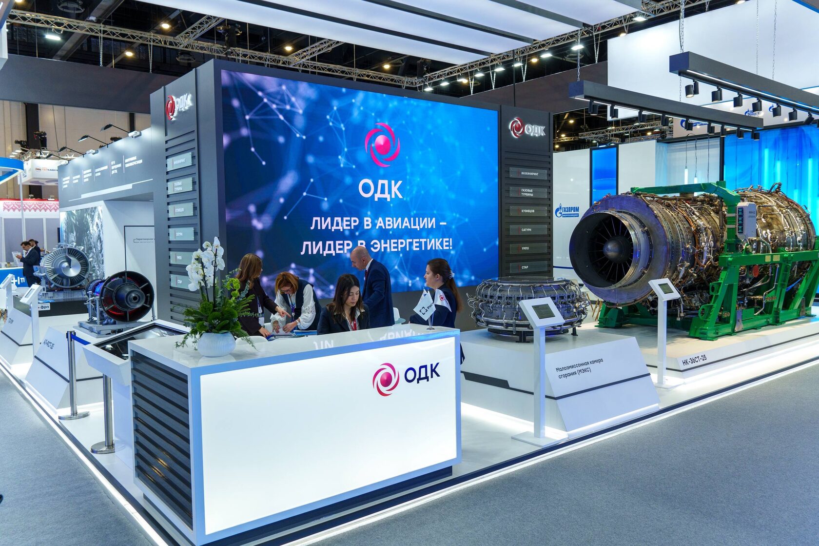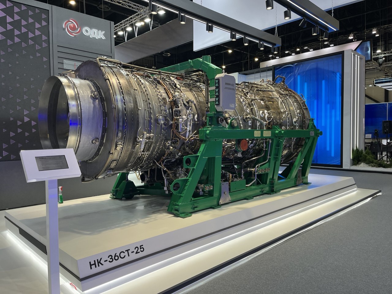 Центральный экспонат стенда ОДК – газотурбинный двигатель НК-36СТ-25 мощностью 25 МВт. Он серийно производится на самарском предприятии ОДК-Кузнецов и применяется для транспортировки газа по магистральным газопроводам.