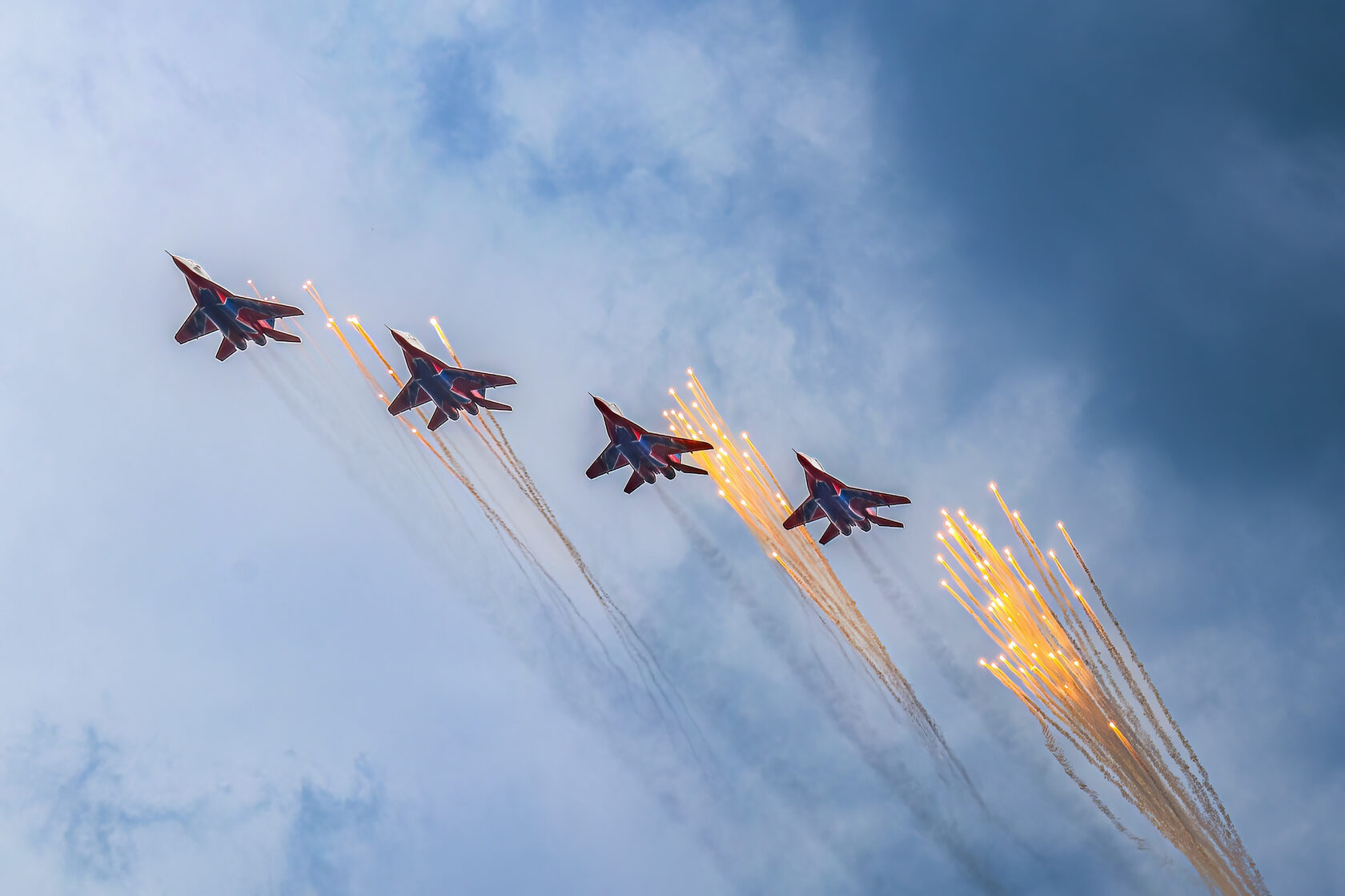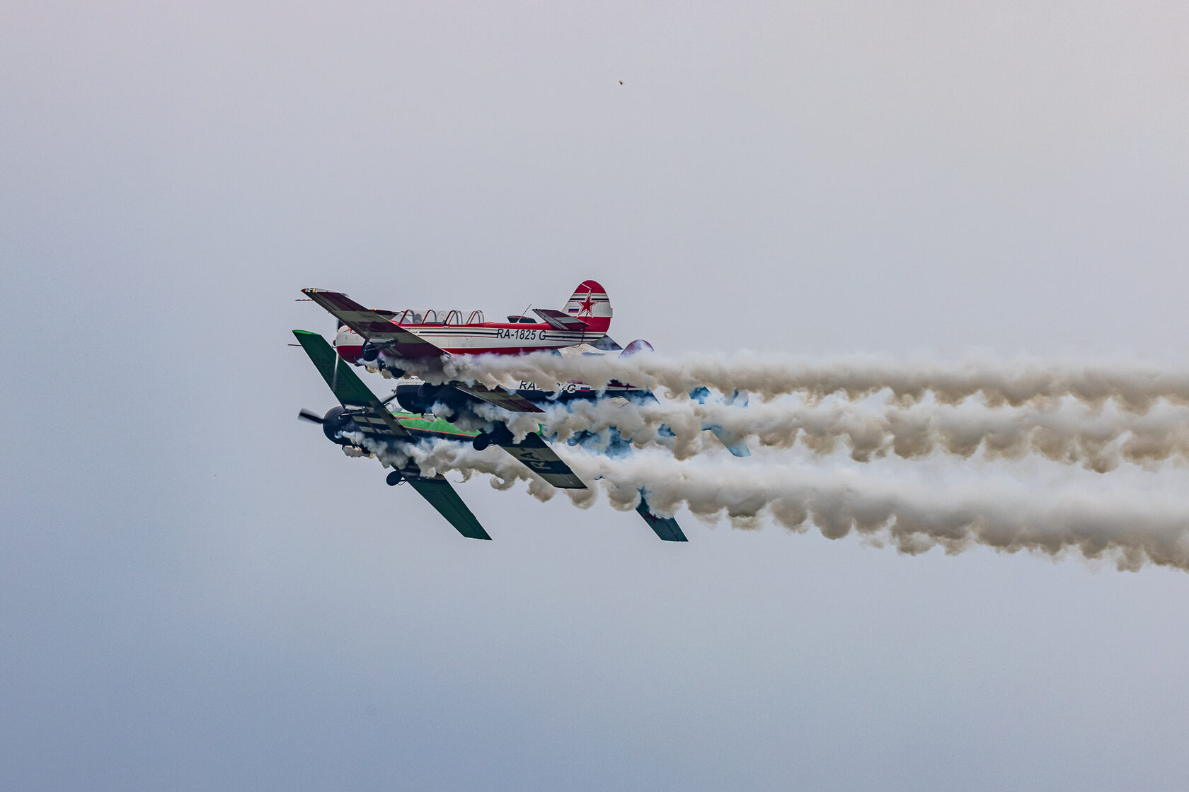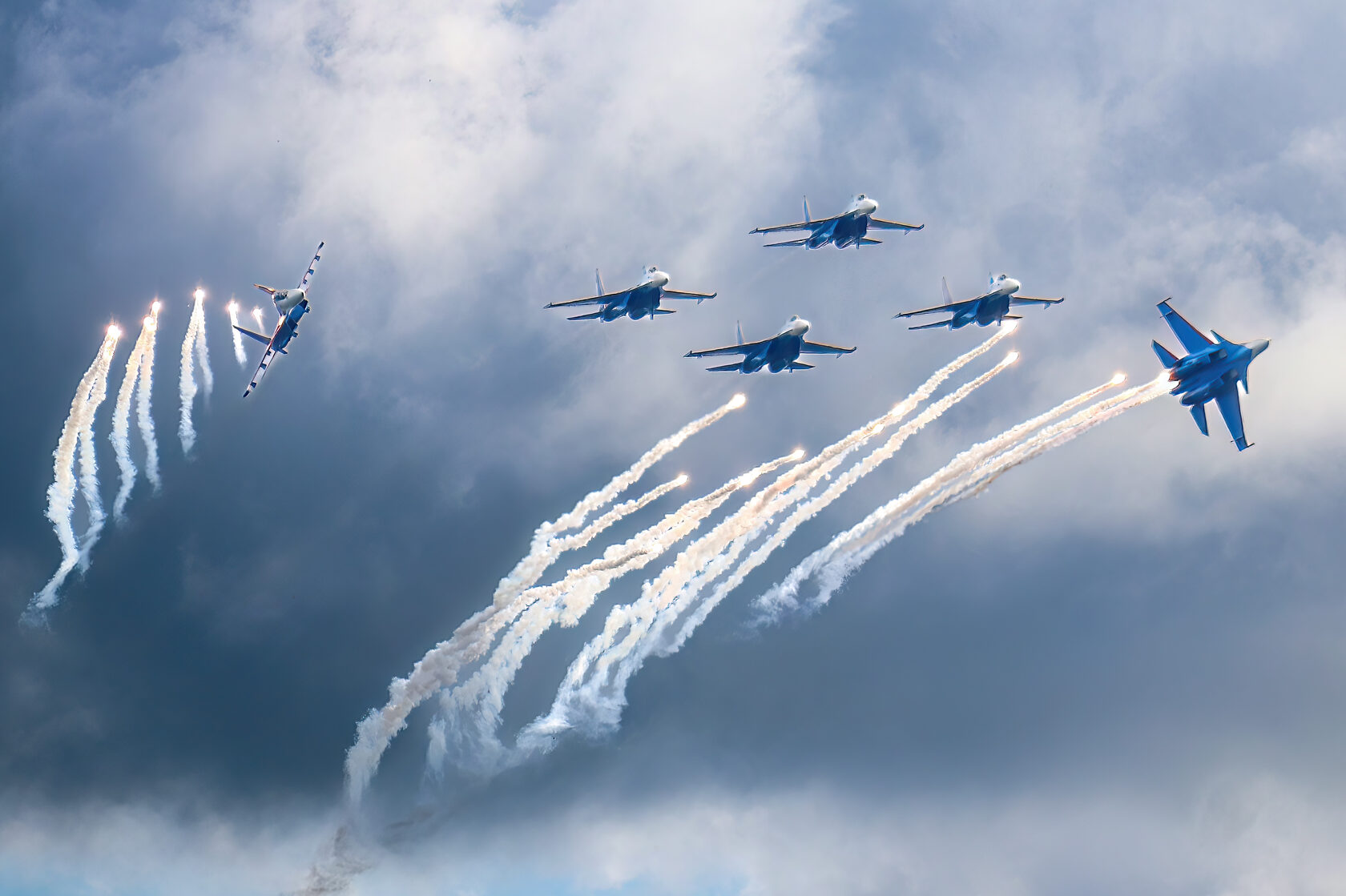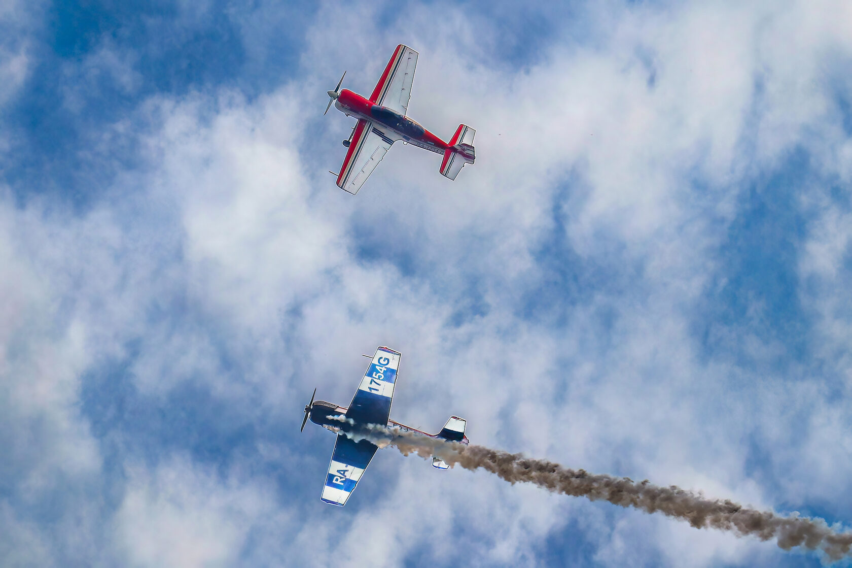 «После доразведки погоды ведущий группы Андрей Алексеев принял решение и согласовал полет на полтора часа раньше запланированного времени. Это позволило выполнить программу, хотя и в сокращенном варианте - без вертикальных фигур, но не менее зрелищно». Во второй день они выступили уже с полной программой.