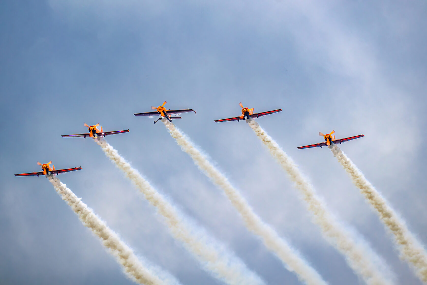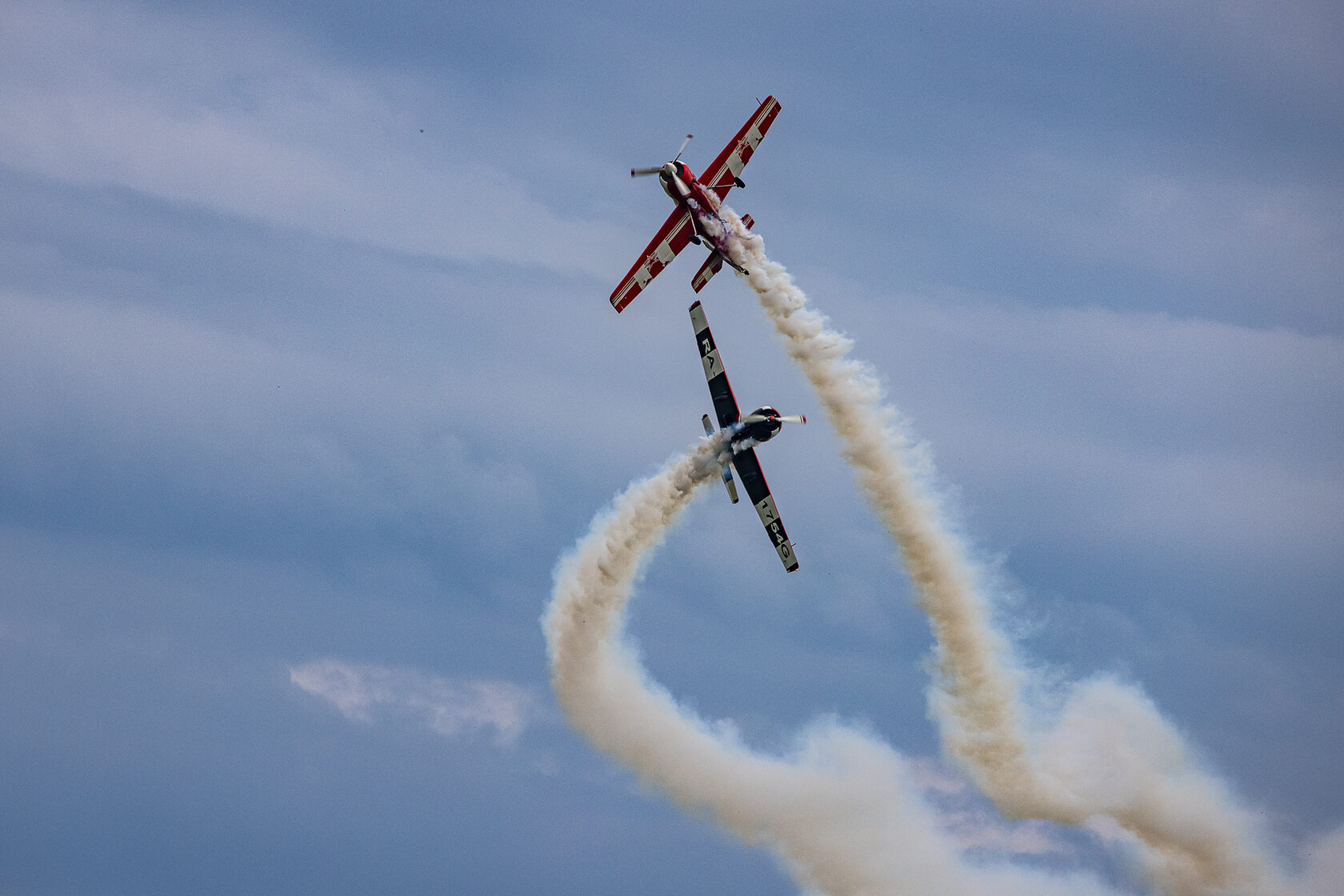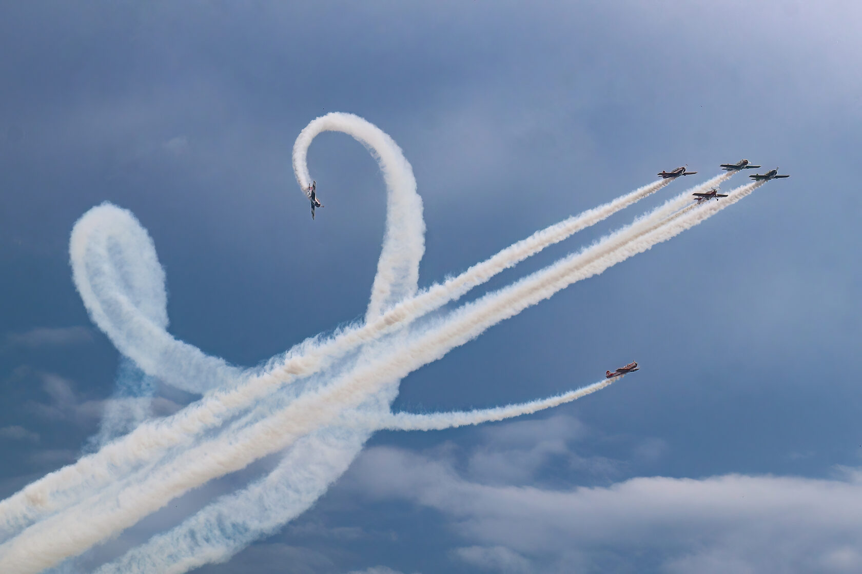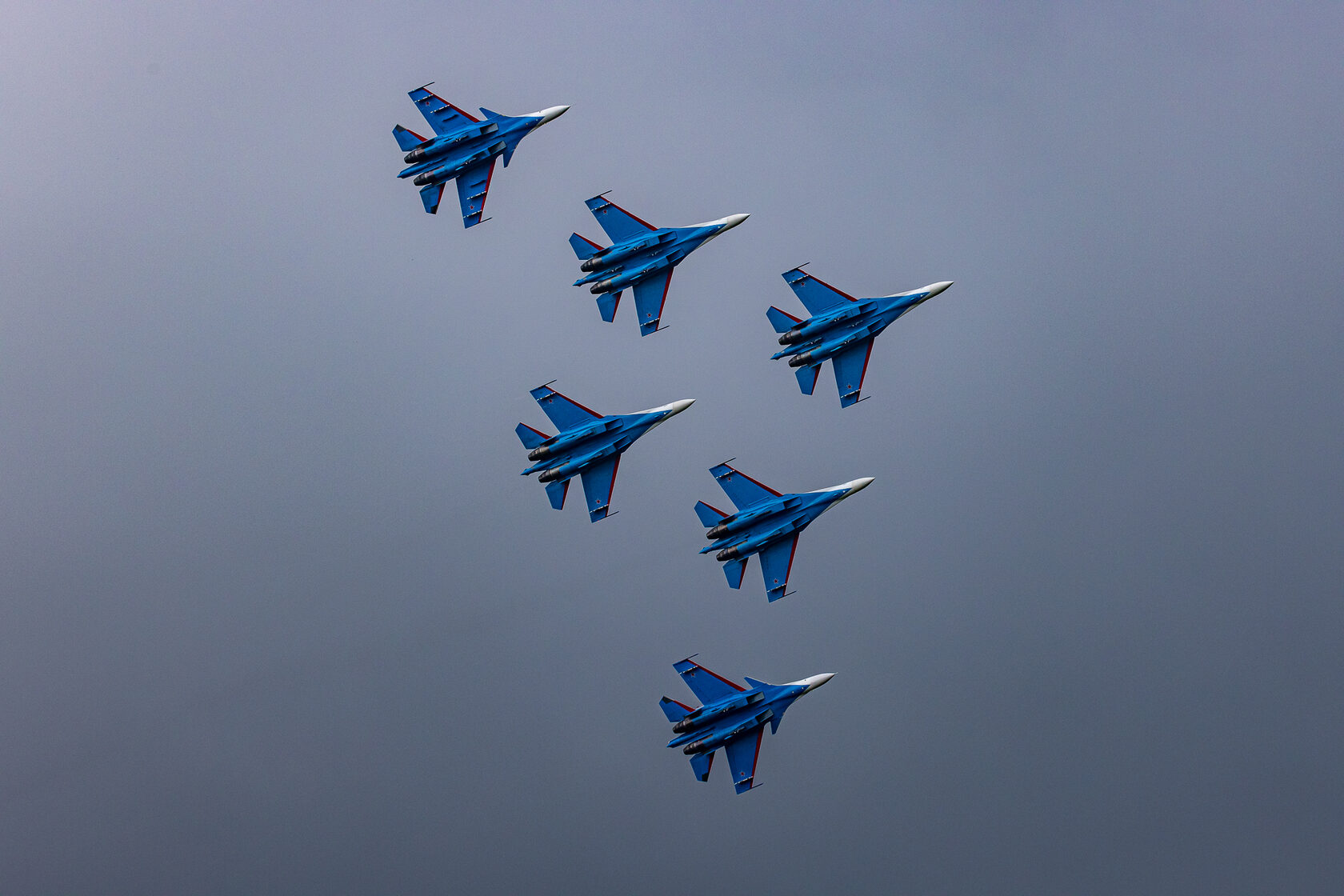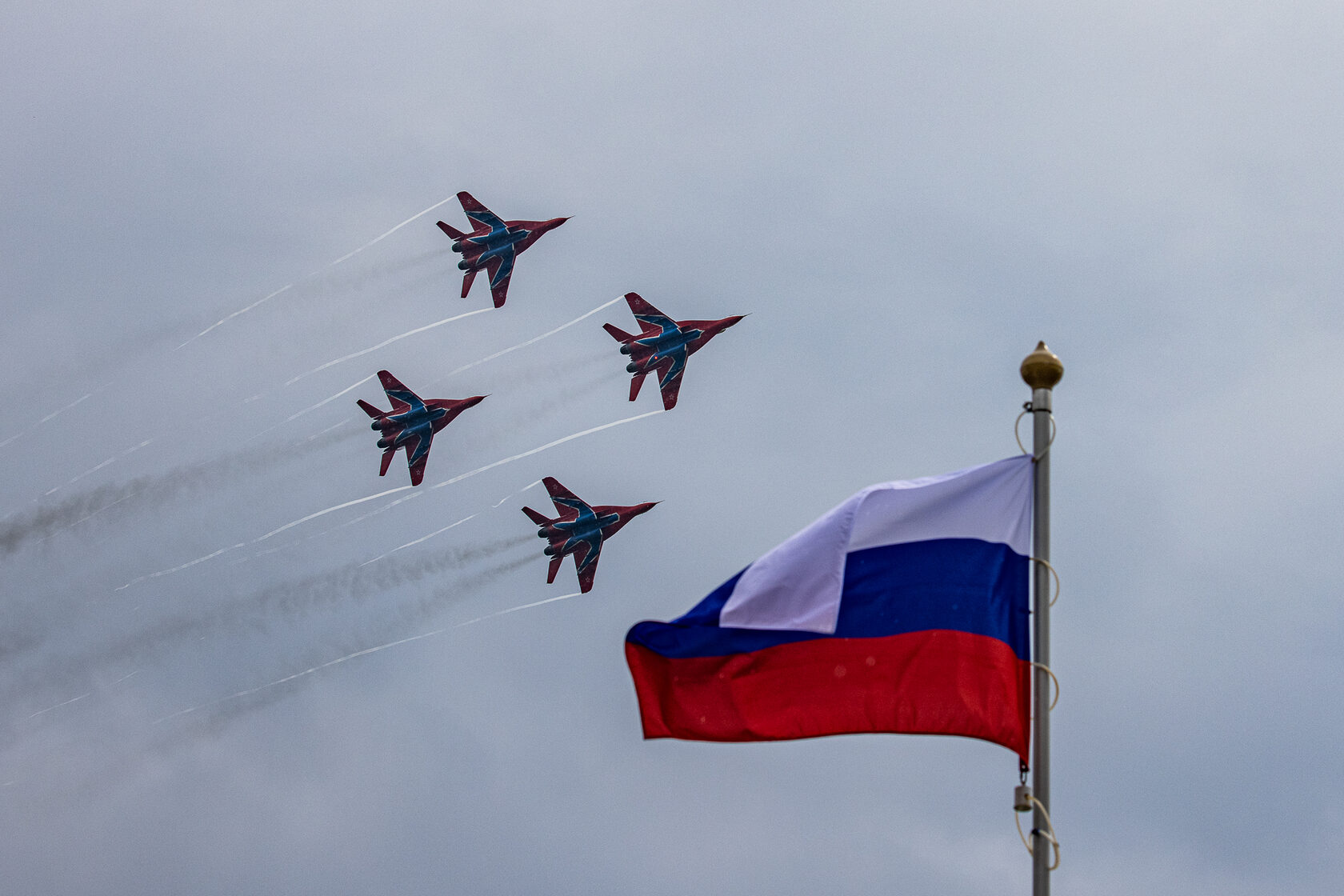 «После доразведки погоды ведущий группы Андрей Алексеев принял решение и согласовал полет на полтора часа раньше запланированного времени. Это позволило выполнить программу, хотя и в сокращенном варианте - без вертикальных фигур, но не менее зрелищно». Во второй день они выступили уже с полной программой.