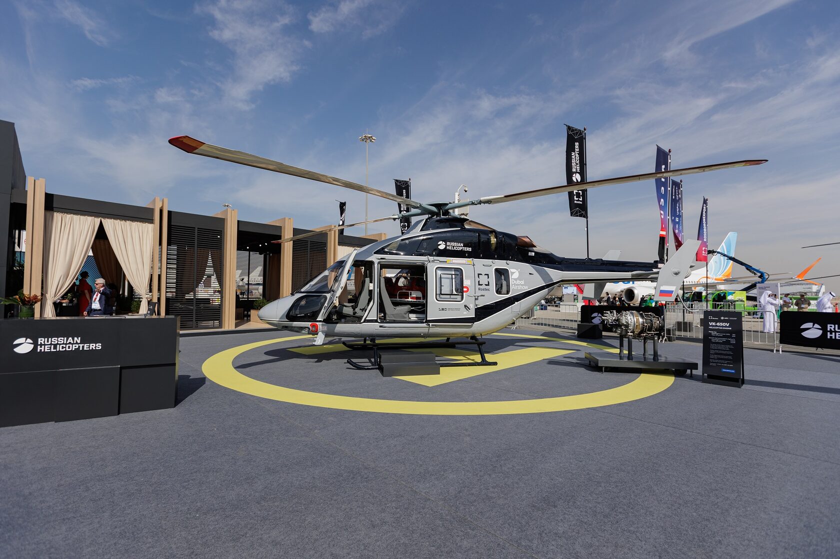 Легкий многоцелевой вертолет «Ансат» представлен в импортозамещенном варианте с российскими двигателями ВК-650В производства Объединенной двигателестроительной корпорации Госкорпорации Ростех. Напомним, 2 сентября 2025 года полностью импортозамещенное воздушное судно совершило первый полет. Помимо ремоторизации, на нем заменили все иностранные комплектующие, включая компоненты системы управления и автопилота. «Ансат-М» получил комплект отечественного бортового оборудования и новую отечественную систему запуска и генерирования постоянного тока. Изменена конструкция фюзеляжа, благодаря увеличению доли композиционных материалов улучшились его весовые характеристики.