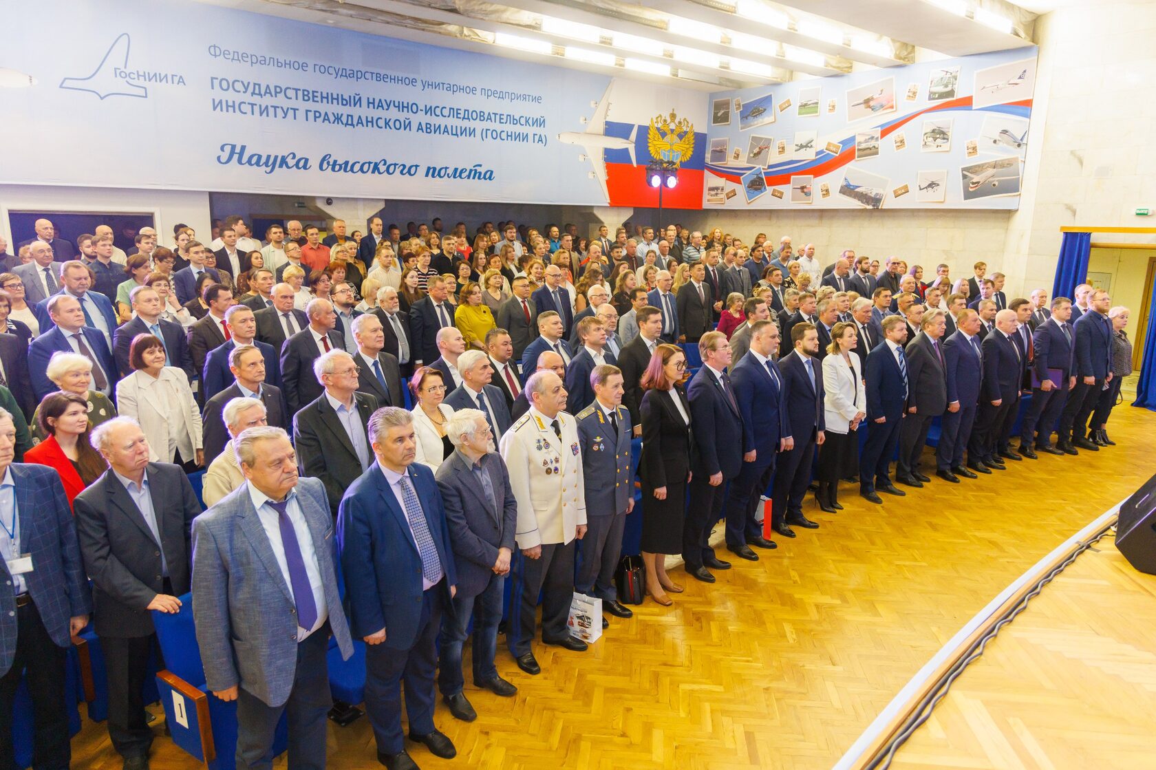 На торжественной части с приветственным словом выступили руководитель Федерального агентства воздушного транспорта Дмитрий Викторович Ядров, председатель Межгосударственного авиационного комитета Олег Георгиевич Сторчевой и генеральный директор ГосНИИ ГА Дмитрий Владимирович Бобылев. Работникам Института вручили награды Минтранса, Росавиации и МАК, а также почетные грамоты и благодарности ГосНИИ ГА. Нагрудным знаком «Почетный работник ФГУП ГосНИИ ГА» отмечены трое работников.